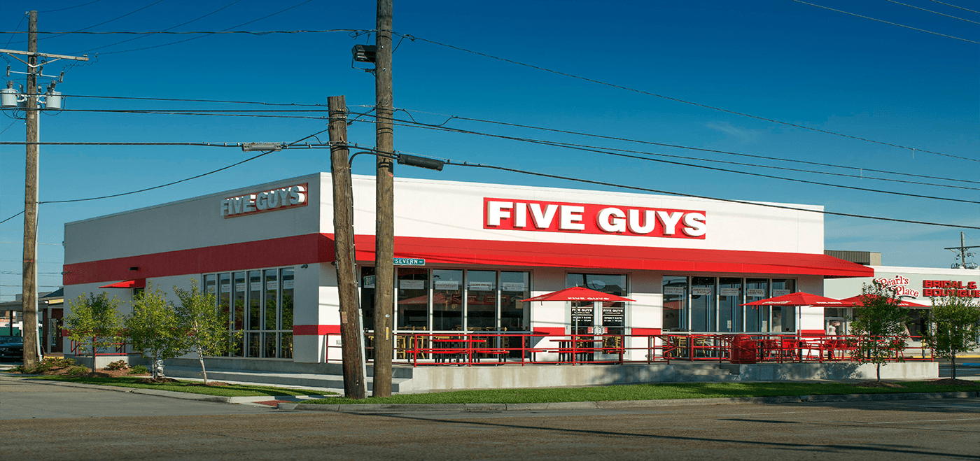 The national food chain Five Guys serves premier burgers, milkshakes, and fries at over 1,700 locations worldwide. Bayou’s Best Burgers contracted Spartan Building Corporation to construct the Covington, Louisiana location.